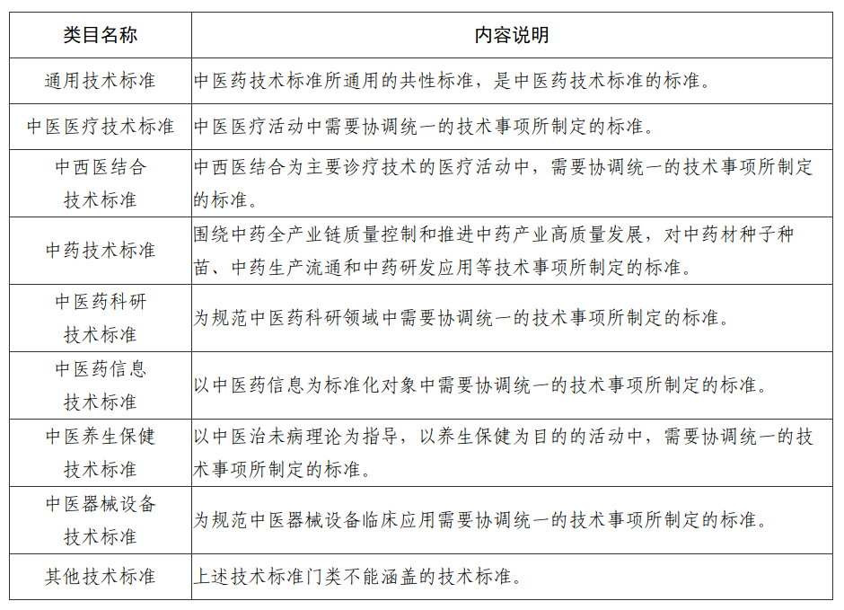 2.中医药技术标准,是指为规范中医药行业中需要协调统一的技术事项所制定的标准。包含9个类目,各类目内容说明见表2。