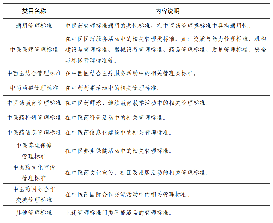 3.中医药管理标准,为规范中医药行业管理,对中医药领域中需要协调统一的管理事项所制定的标准,是管理机构为行使其管理职能而制定的具有特定管理功能的标准。包含11个类目,各类目内容说明见表3。