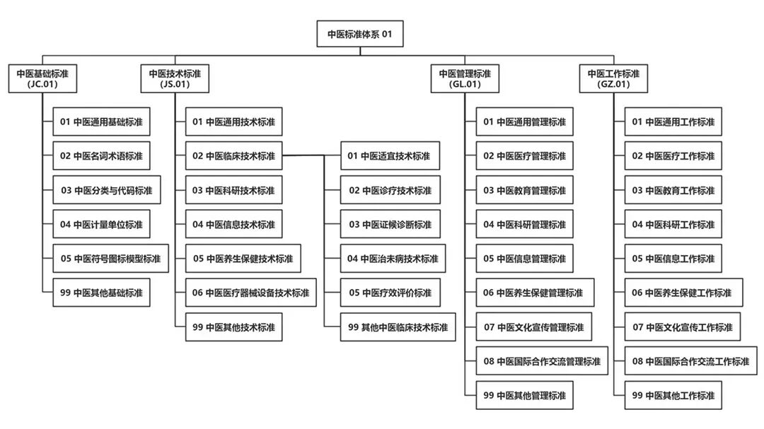 第三层:按照中医药各专业领域下的业务类型进行划分,用2位阿拉伯数字表示。其中01表示通用类标准……99代表其他。