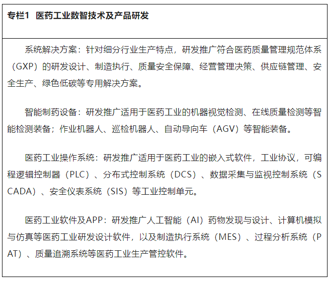 此外,《通知》提出,要加强医药工业数智产品研发应用,针对中药等细分行业生产特点,打造符合医药质量管理规范体系(GXP)的系统解决方案,研发推广智能制药设备、检测设备,开发医药工业软件或系统等。