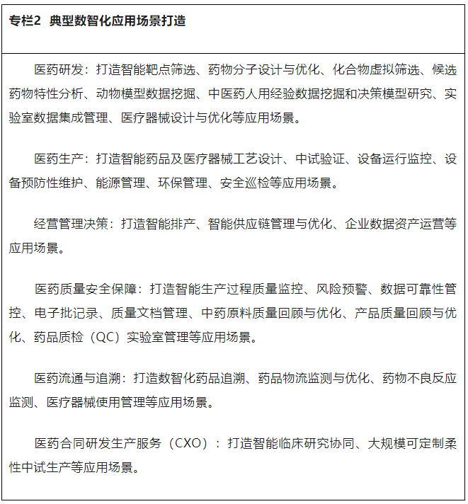 1.推广典型数智技术应用卓越场景。围绕医药研发、医药生产、经营管理决策、医药质量安全保障、医药流通与追溯、医药合同研发生产服务(CXO)等方面,系统梳理数智化转型场景清单,以及数据要素、知识模型、工具软件、人才技能等要素清单,支持医药企业和信息技术服务企业联合打造数智化应用场景,系统化推进医药企业数智化转型。