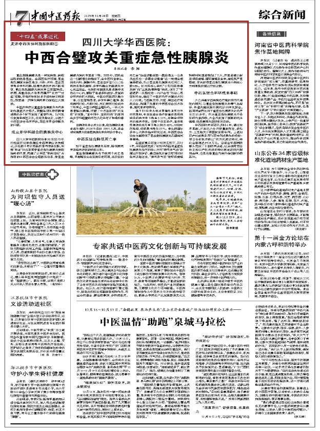 10月24日,《中国中医药报》聚焦四川大学华西医院:中西合璧攻关重症急性胰腺炎,全文如下。