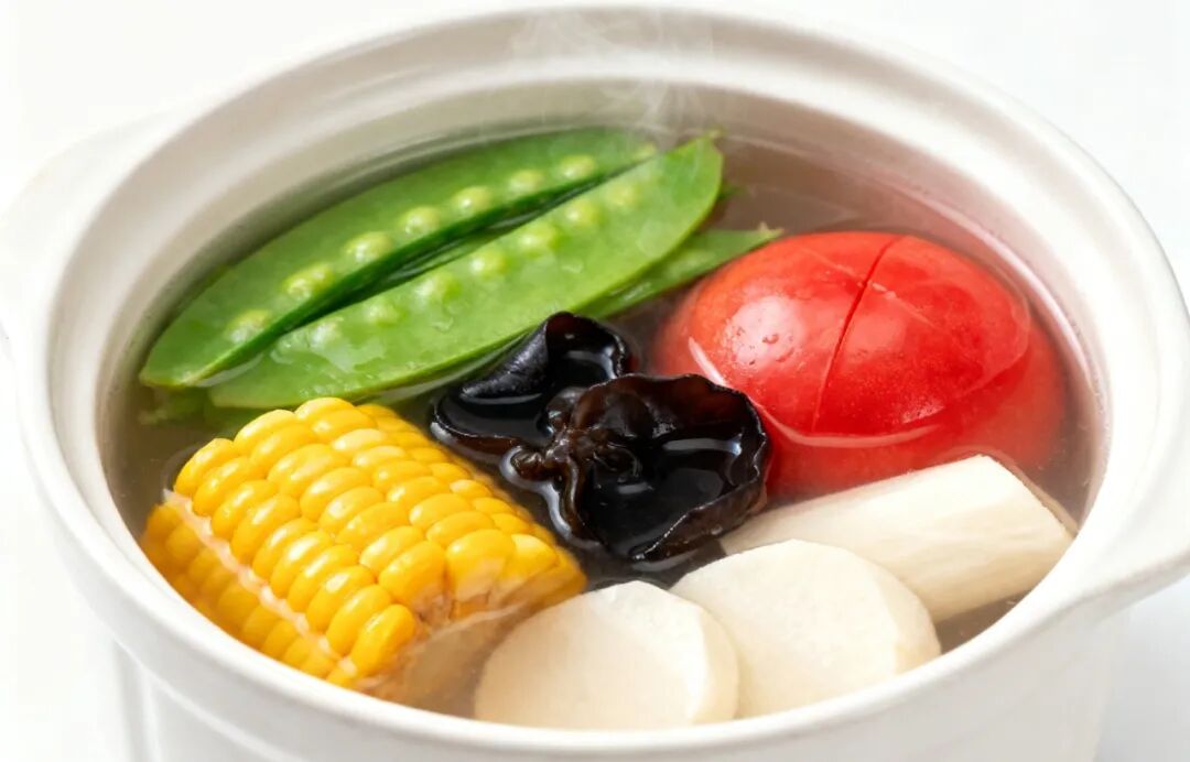 1.荷兰豆洗净,撕去两边的筋丝;玉米切段;番茄切块;黑木耳提前泡发,撕成小朵;山药去皮切块。