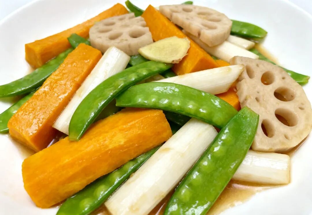 材料:南瓜、莲藕、荷兰豆、植物油、姜、盐。