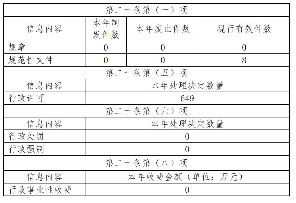 (三)政府信息管理情况。贯彻落实《四川省人民政府办公厅公文公开属性认定管理办法》(川办发〔2023〕36号),做好政策文件公开属性源头认定,加强规范性文件管理,及时按要求公开。2024年新增主动公开规范性文件0件,废止0件,现行有效8件。