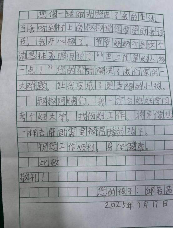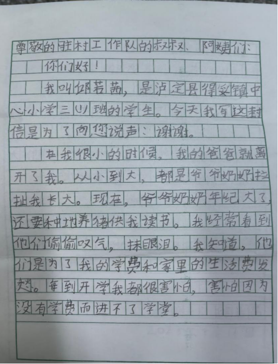 近日我收到了一封特别的感谢信,字里行间满是对驻村工作队的感谢。"您像一缕阳光照进我的生活,让我变成更幸福的小孩,我一定好好学习,将来向您一样去帮助需要被温暖的孩子......"九岁邱若茜小朋友的这封感谢信,像一簇跳动的火苗,温暖了我的乡村振兴路。