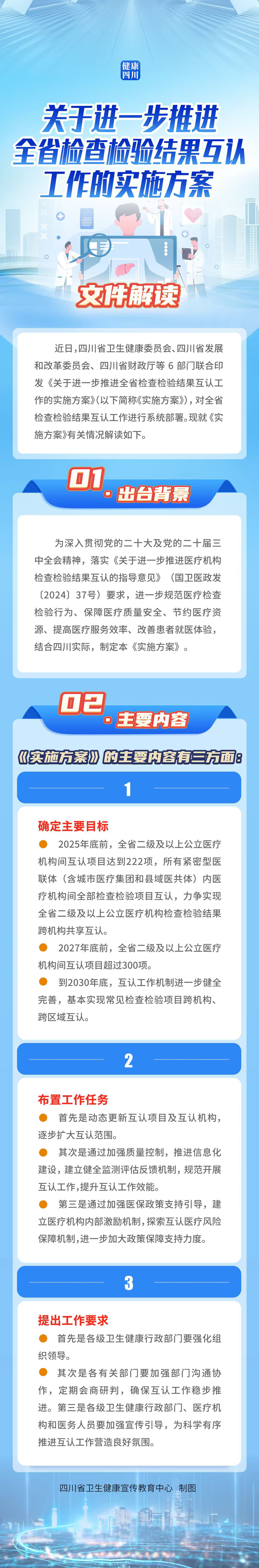 近日,四川省卫生健康委员会、四川省发展和改革委员会、四川省财政厅等6部门联合印发《关于进一步推进全省检查检验结果互认工作的实施方案》(以下简称《实施方案》),对全省检查检验结果互认工作进行系统部署。现就《实施方案》有关情况解读如下。