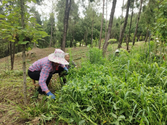 阳光穿过高大茂密的松柏林,在林下投下一片片阴影。8月27日,在林下的阴凉里,淫羊藿连成一片,生机勃勃,射箭镇云峰村的村民们正有说有笑地做着农活——为淫羊藿除草。